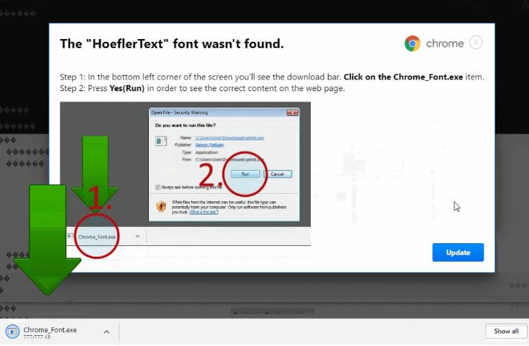 “Update” düğmesine bastığınızda bilgisayarınıza “Chrome Font v7.5.1.exe” adlı bir dosya indiriliyor ve açılır kutucuk görüntüden kayboluyor, bunun yerine yazı tipini nasıl yükleyeceğinize dair talimatlar gösteriliyor. İddiaya göre Chrome, dosyayı zararlı olarak tanımıyor ve zararlı, Windows Defender’ın da gözünden kaçıyor.